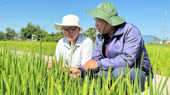 Cán bộ Trung tâm Trồng trọt và Bảo vệ thực vật miền Trung điều tra tình hình sâu bệnh trên ruộng lúa áp dụng mô hình IPHM. Ảnh: L.K.
