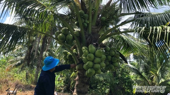 Dừa dứa thuộc giống dừa lùn, cho trái quanh năm, nếu trồng đúng kỹ thuật mỗi cây có thể cho thu hoạch hơn 200 trái/năm, mang lại thu nhập tốt cho nhà vườn. Ảnh: Trung Chánh.