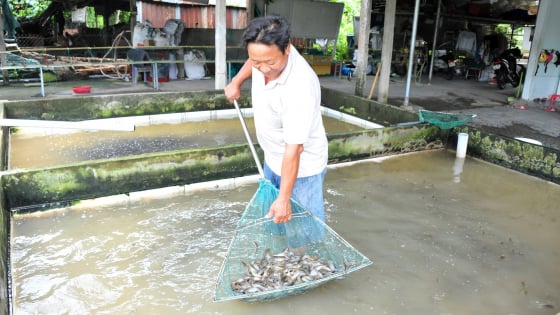 Chủ cơ sở sản xuất cá giống ở xã Vĩnh Xương (An Giang) thu hoạch cá giống cung ứng cho thị trường. Ảnh: Lê Hoàng Vũ.