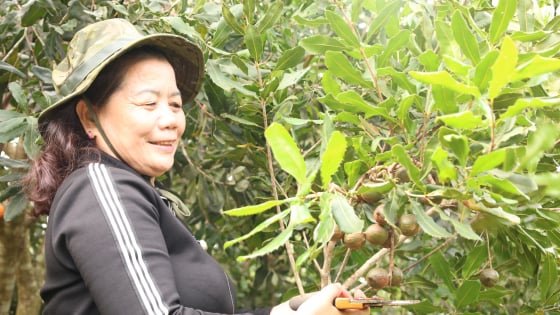 Bà Dung bên những chùm quả mắc ca trĩu hạt. Ảnh: Thanh Tâm.