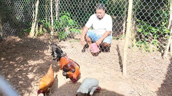Anh Chau Đinh chăm sóc đàn gà lai Mỹ – Thái trong khu vườn tầm vông, áp dụng phương pháp nuôi thả tự nhiên giúp đàn gà phát triển khỏe mạnh. Ảnh: Lê Hoàng Vũ.