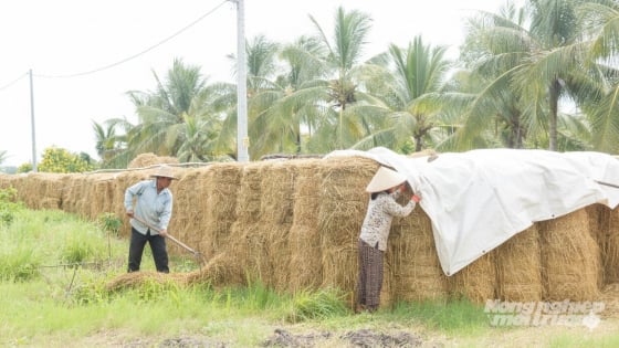 Rơm được thu gom để trồng nấm, vừa giảm ô nhiểm môi trường vừa cho thu nhập thứ 2 cho nông dân sau hạt lúa. Ảnh: Trung Chánh.