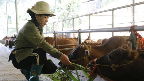 Giữa trưa, nắng đã trên đỉnh đầu, chị Xoa vẫn luôn tay tra từng bó cỏ vào chiếc máy cắt, tiếng máy vang động cả một góc bản, xung quanh đàn bò đang ngước cổ chờ đến giờ ăn. Trại nuôi trâu, bò của vợ chồng chị Nông Thị Xoa và anh Giàng Văn Tiến ở thôn Bản Đính, xã Nghiên Loan (Thái Nguyên) thuộc dạng quy mô lớn nhất ở xứ miền núi cao này.