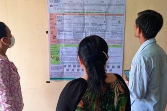 Cán bộ kỹ thuật trao đổi cùng nông dân về chất lượng lúa trong mô hình canh tác thân thiện với môi trường. Ảnh: Lê Hoàng Vũ.